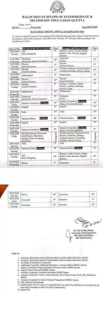 The Balochistan Board of Intermediate and Secondary Education (BBISE), Quetta has officially announced the Matric Date Sheet 2026 for both 9th and 10th classes. According to the notification, the SSC Annual Examinations 2026 will begin on Tuesday, February 10, 2026, and will continue until the first week of March.