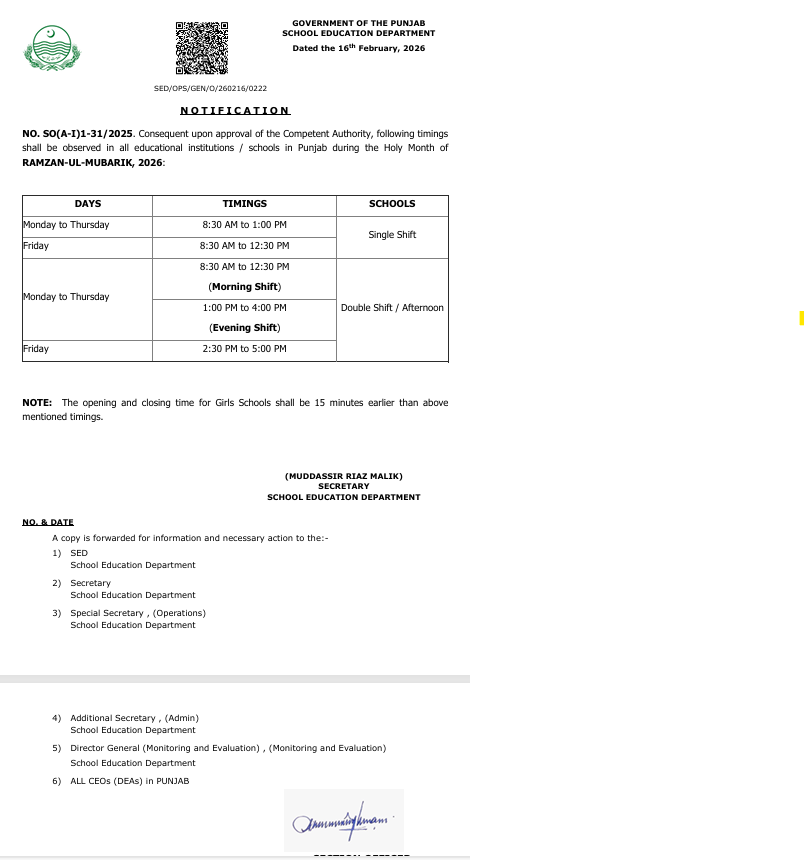 The Government has officially revised school schedules for the holy month of Ramadan to support students, teachers, and parents observing fasting. According to the notification issued by the School Education Department, Punjab, all public and private institutions across Punjab will follow adjusted timings designed to reduce fatigue and maintain academic continuity.